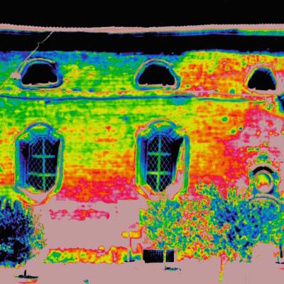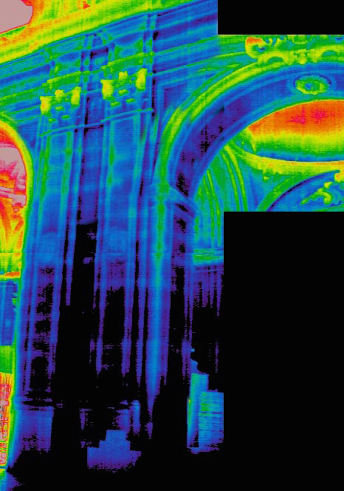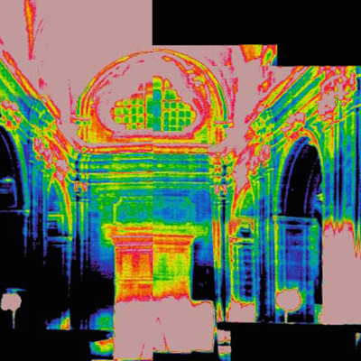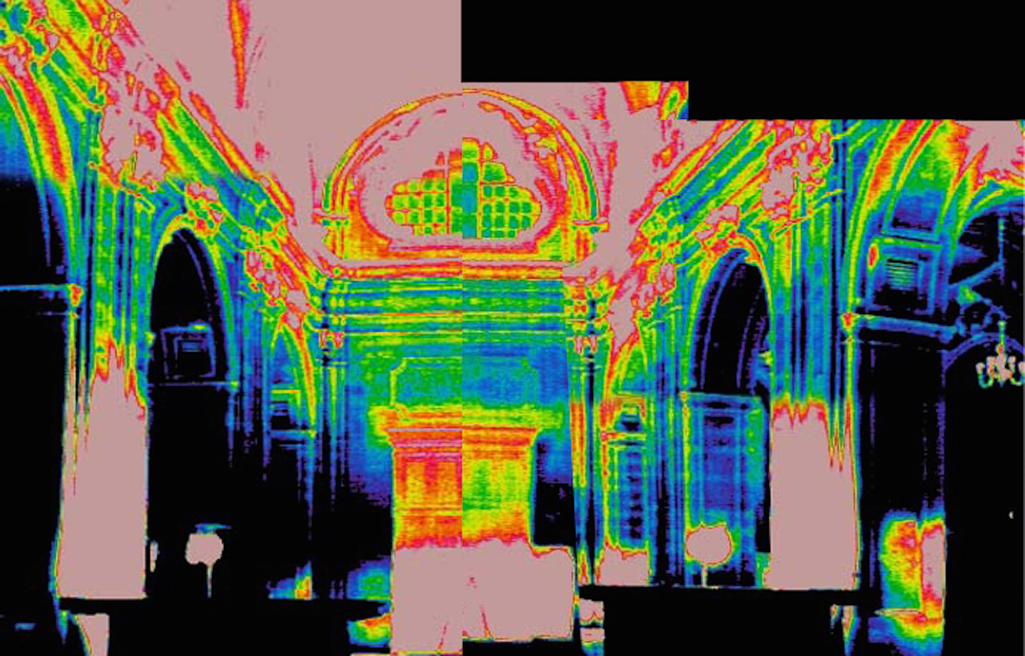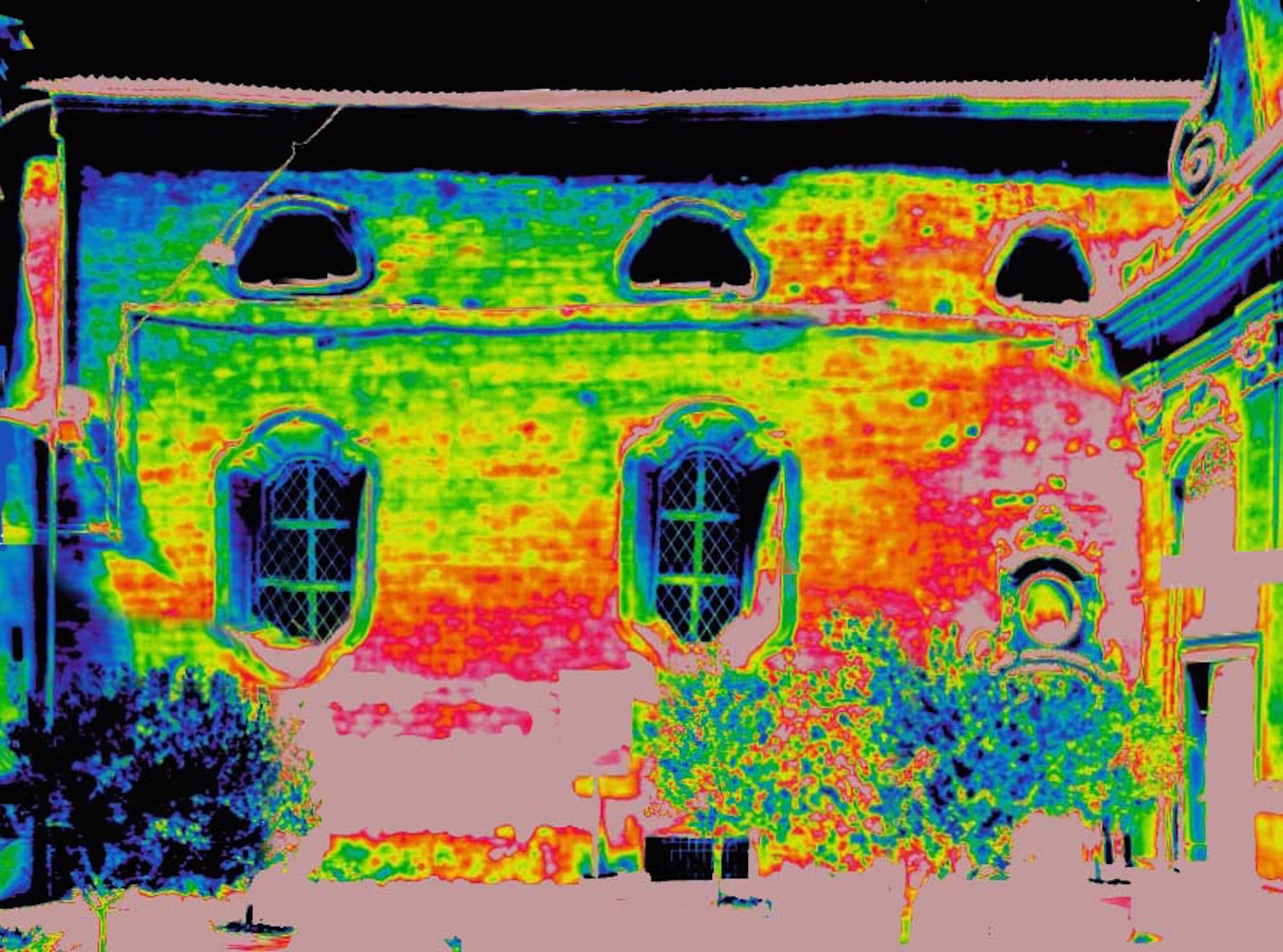 L’indagine termografica dell’interno e dell’esterno è stata finalizzata alla lettura dello strato corticale della muratura, con lo scopo di determinare la tessitura muraria e cercare di fornire elementi utili per guidare le fasi operative dell’intervento di conservazione della fabbrica.