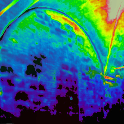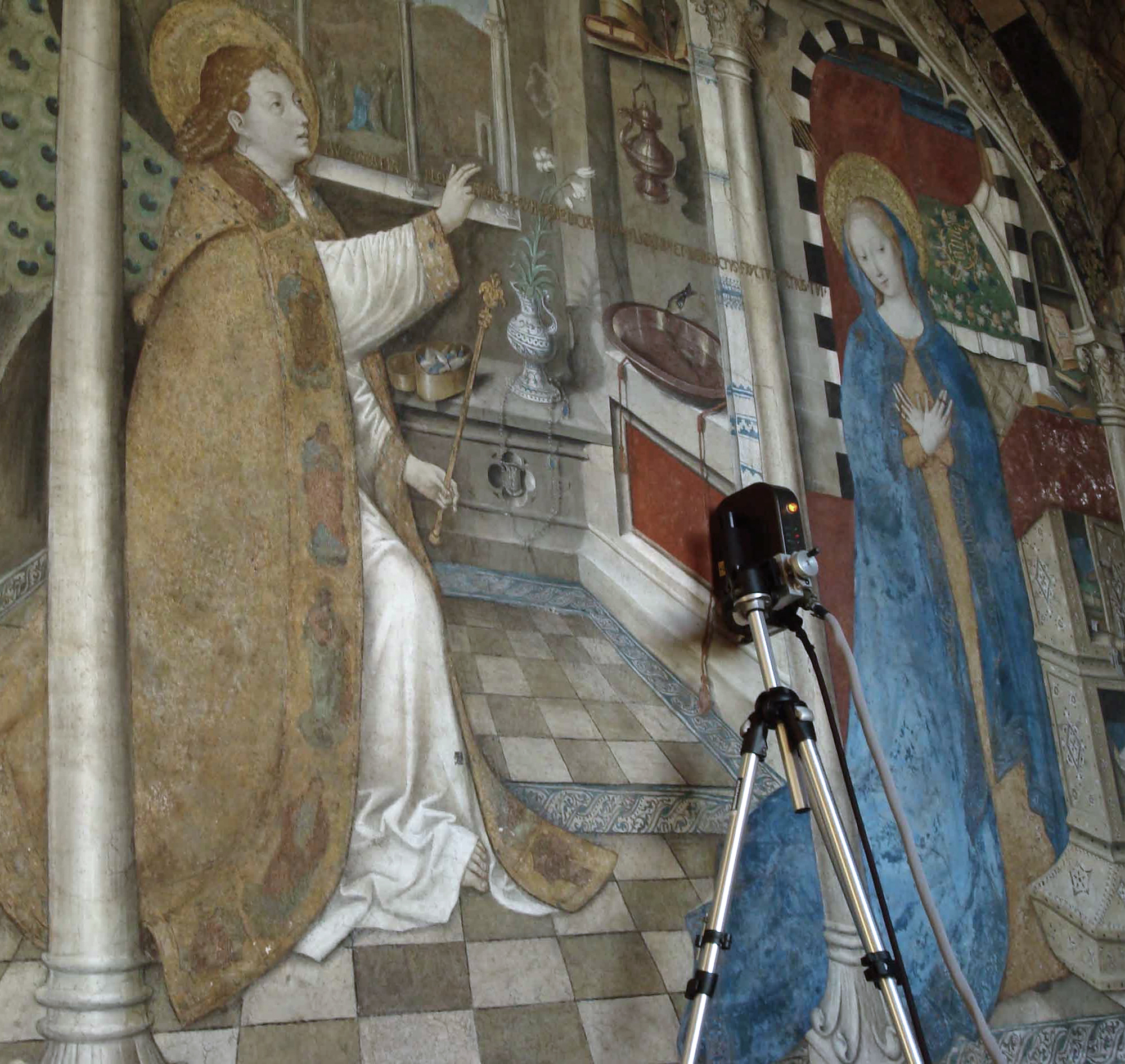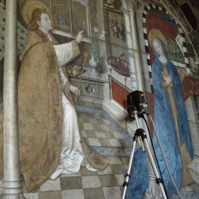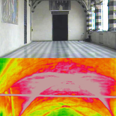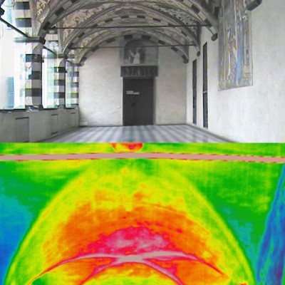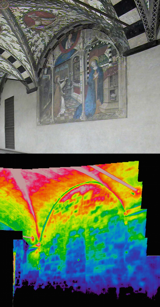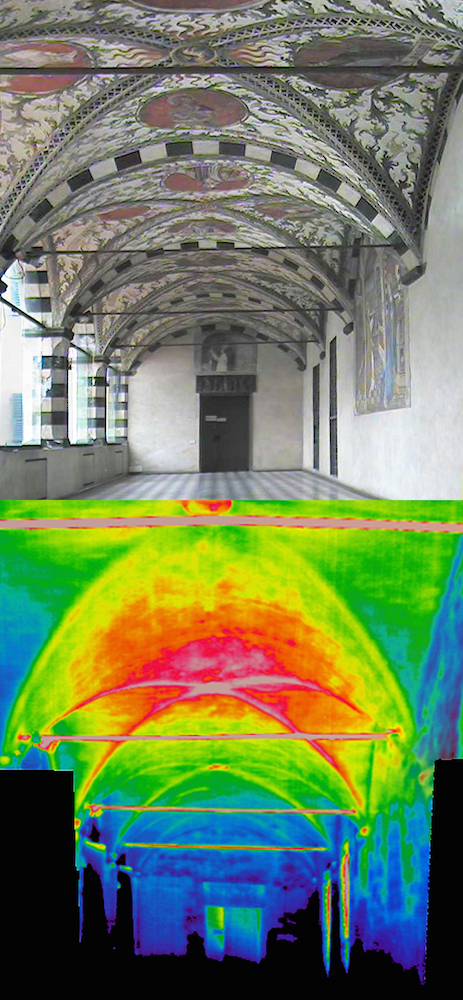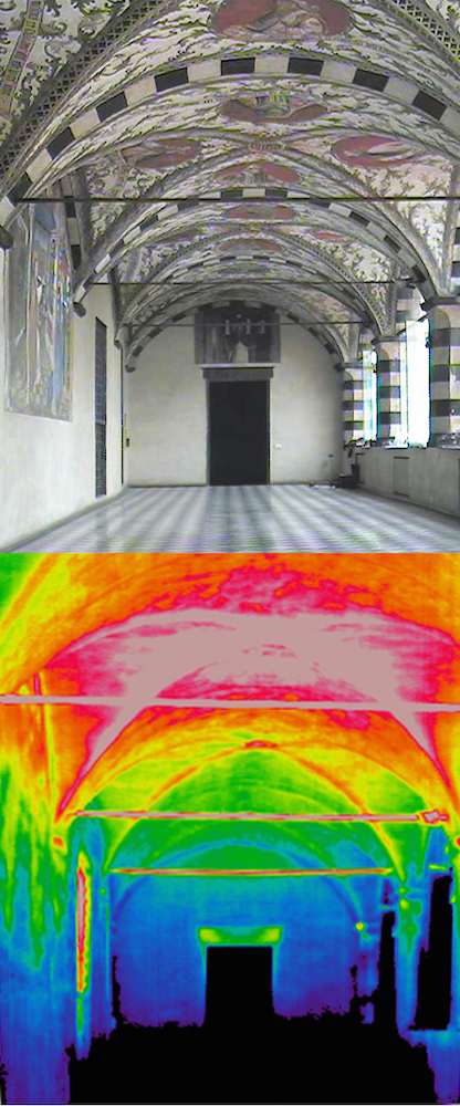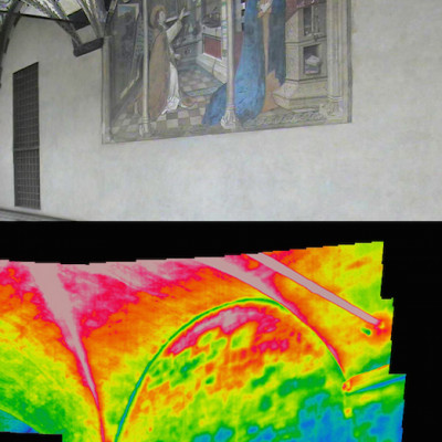 Obiettivo dell’indagine termografica è stata la lettura dello strato corticale della muratura, con lo scopo di determinare la tessitura muraria e cercare di fornire elementi utili per il monitoraggio delle superfici ad affresco.
